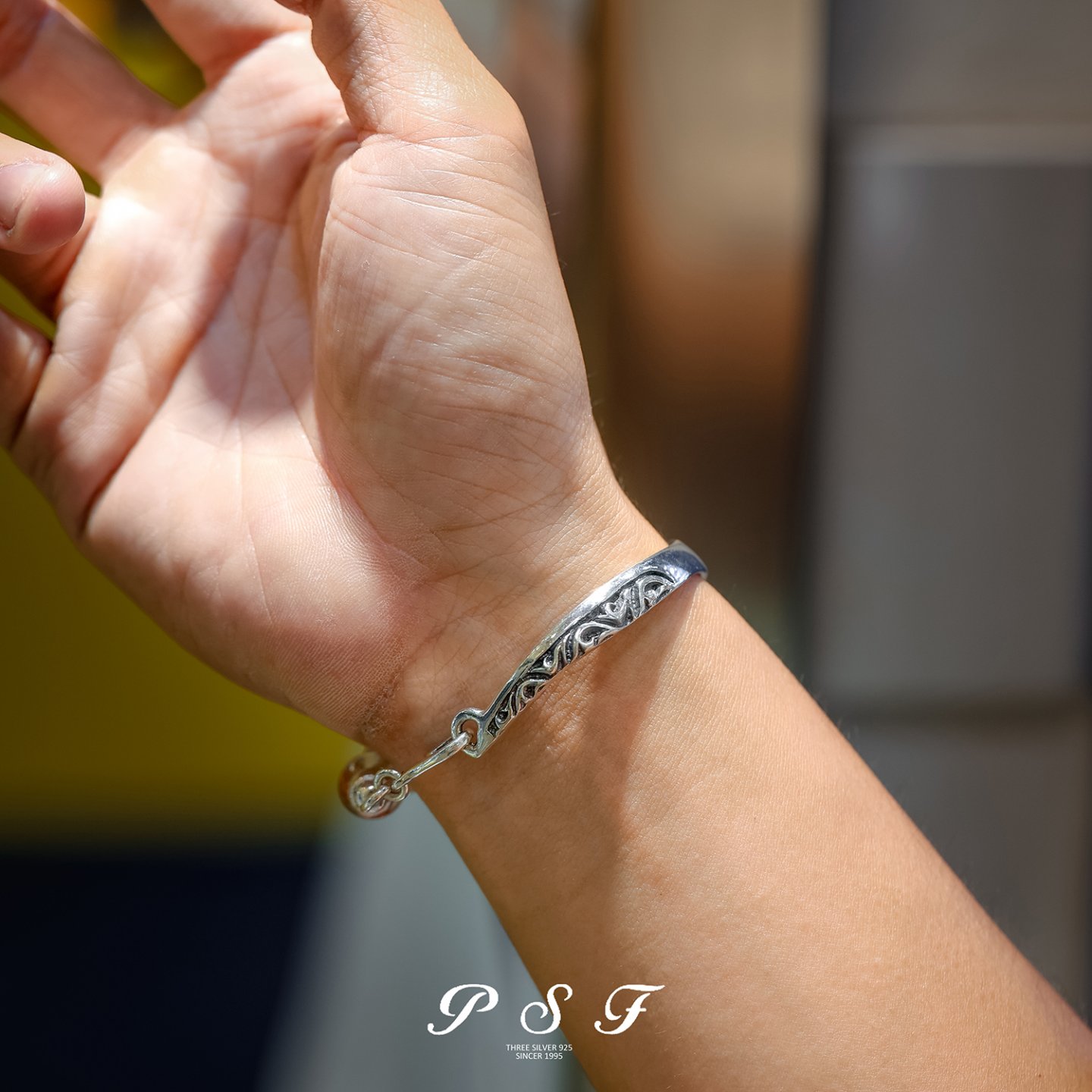 是一款大膽設計與精緻工藝完美融合的獨特飾品 半環式的純銀部分 彰顯出沉穩與豪邁的氣質 其上雕刻的中式圖騰 帶來濃厚的傳統文化意境 將歷史的厚重感與現代的潮流感巧妙結合