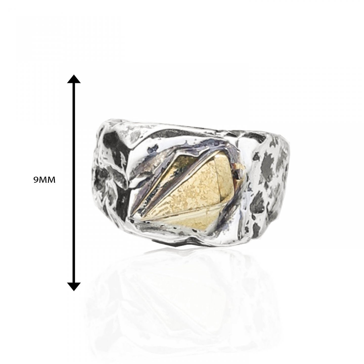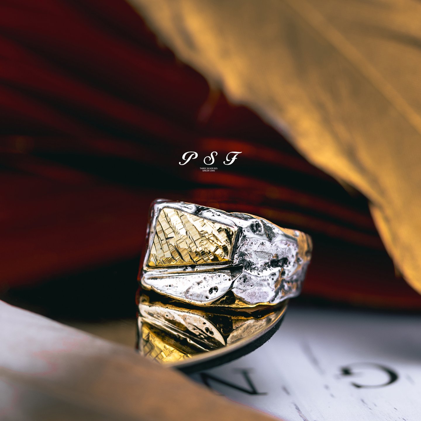 銀灰戒身 如隕石穿越蒼穹後的殘痕 粗獷而滄桑 刻畫著宇宙沉落的詩篇 金色火焰熔鑄其中 彷彿星核尚未熄滅的餘燼 在銀色荒原上燃燒最後的輝煌